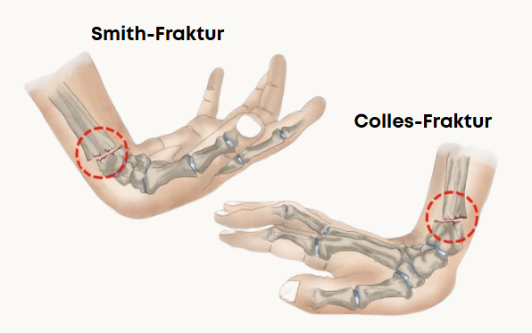 Dabei ruft der Sturz auf die gebeugte Hand meist die sogenannte Colles-Fraktur hervor, während ein Sturz auf die gestreckte Hand meist zu einer Smith-Fraktur führt.